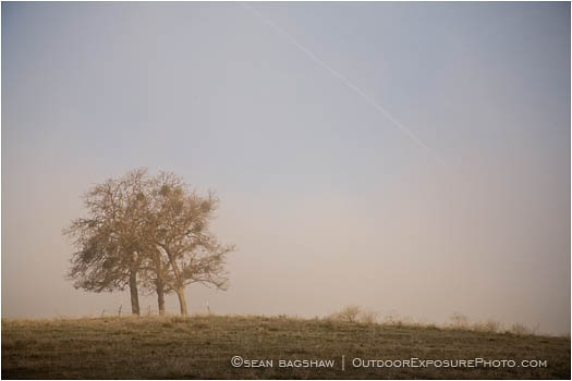 trees, tree, standing, lone, out there, quiet, foggy, fog, morning, misty, mist, small, group, 3, three, trio, clustered, seperated, hill, horizontal, color image