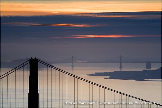 This stock photo contains the subjects San Francisco, California, San Francisco Bay, Golden Gate Bridge, Bay Bridge, Bridge, sunrise, Dawn, city, skyline.