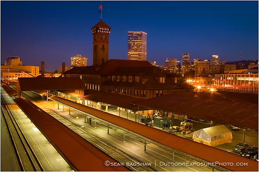 This stock photo contains the subjects portland, oregon, city, cityscape, night, time, tower, station, train, building, union.
