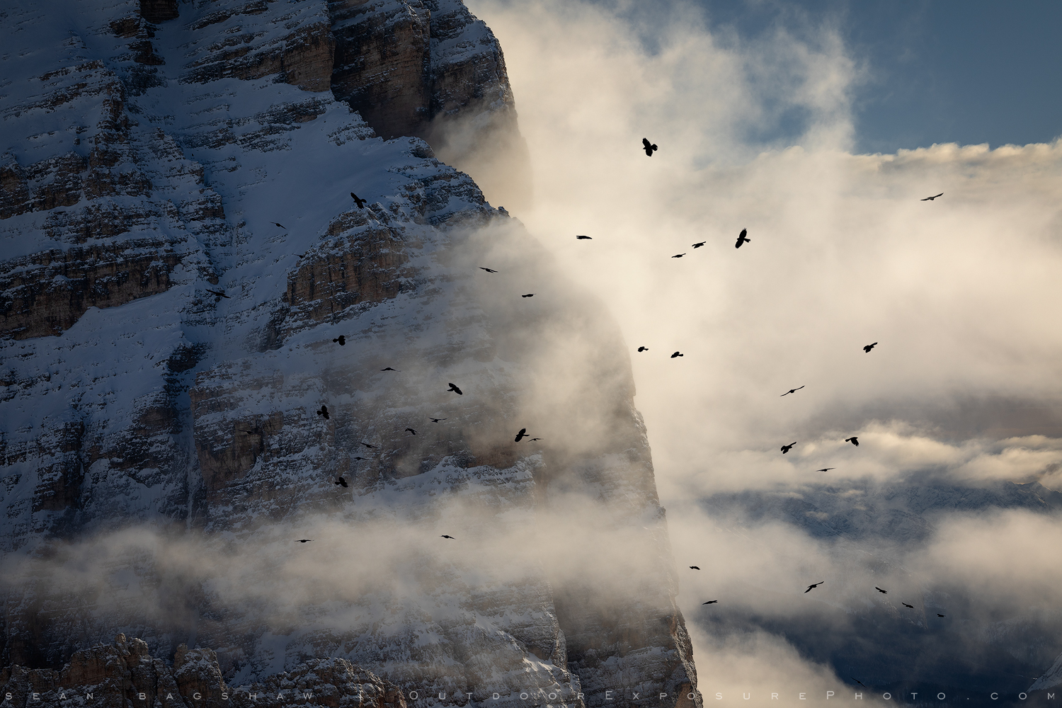 The ubiquitous black birds, Alpine Chough, are members of the crow family. Here they are riding thermals near the peak Tofana di Rozes. Uplift.
