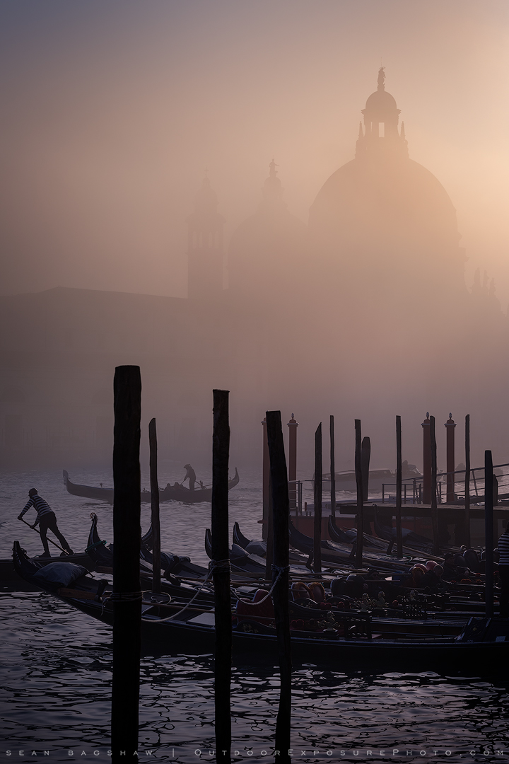 The Basilica di Santa Maria della Salute rising through the fog along the Grand Canal in Venice. Venetian sunsets are not to be missed.