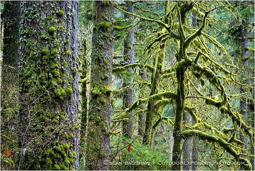 This stock photo contains the subjects moss, green, forest, rain, rain forest, lush, dense, Oregon, Silver Creek.