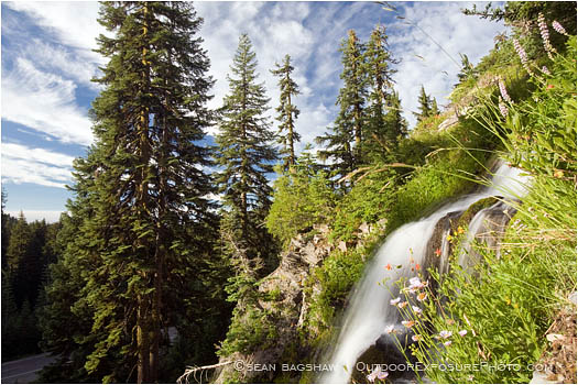 Wildflowers grow alongside Vidae Falls in Crater Lake National Park in Southern Oregon.