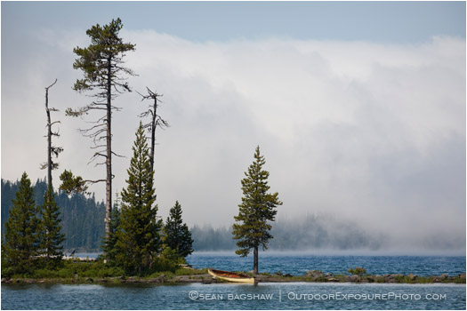 waldo lake, lake, water, camping, canoe, fog, island, foggy, oregon, cascade, mountains, tree, trees, rocks, person, cascades, land, standing out, middle, group, cluster, horizontal, color image