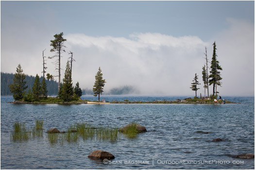 waldo lake, lake, water, camping, canoe, fog, island, foggy, oregon, cascade, mountains, tree, trees, rocks, person, cascades, land, standing out, middle, group, cluster, horizontal, color image, grass