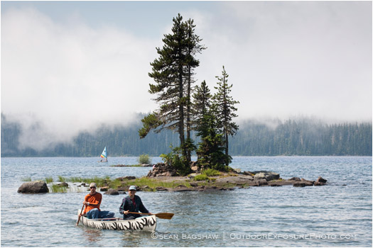 waldo lake, lake, water, camping, canoe, fog, island, foggy, oregon, cascade, mountains, tree, trees, rocks, person, cascades, land, standing out, middle, group, cluster, horizontal, color image, recreation, pair, 2, two, boat, rowing, canoing