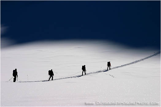 mountaineering, mountain, mountains, climber, climbing, climb, hikers, hiking, line, group, 4, four, rope, staying, together, silhouettes, shadow, snow, snowy, backpacking, backpackers, horizontal, color image
