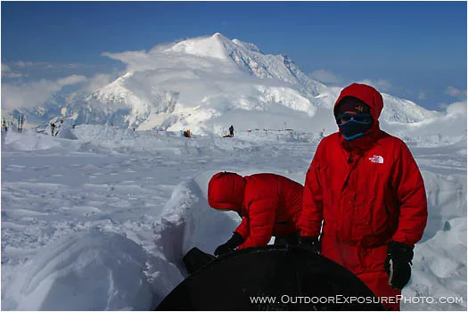 denali, national park, warm, bundled, thoughts, covered, alaska, snow, snow capped, mountains, mountain, peak, red, jacket, staying warm, people, 2, two, group, pair, horizontal, color image