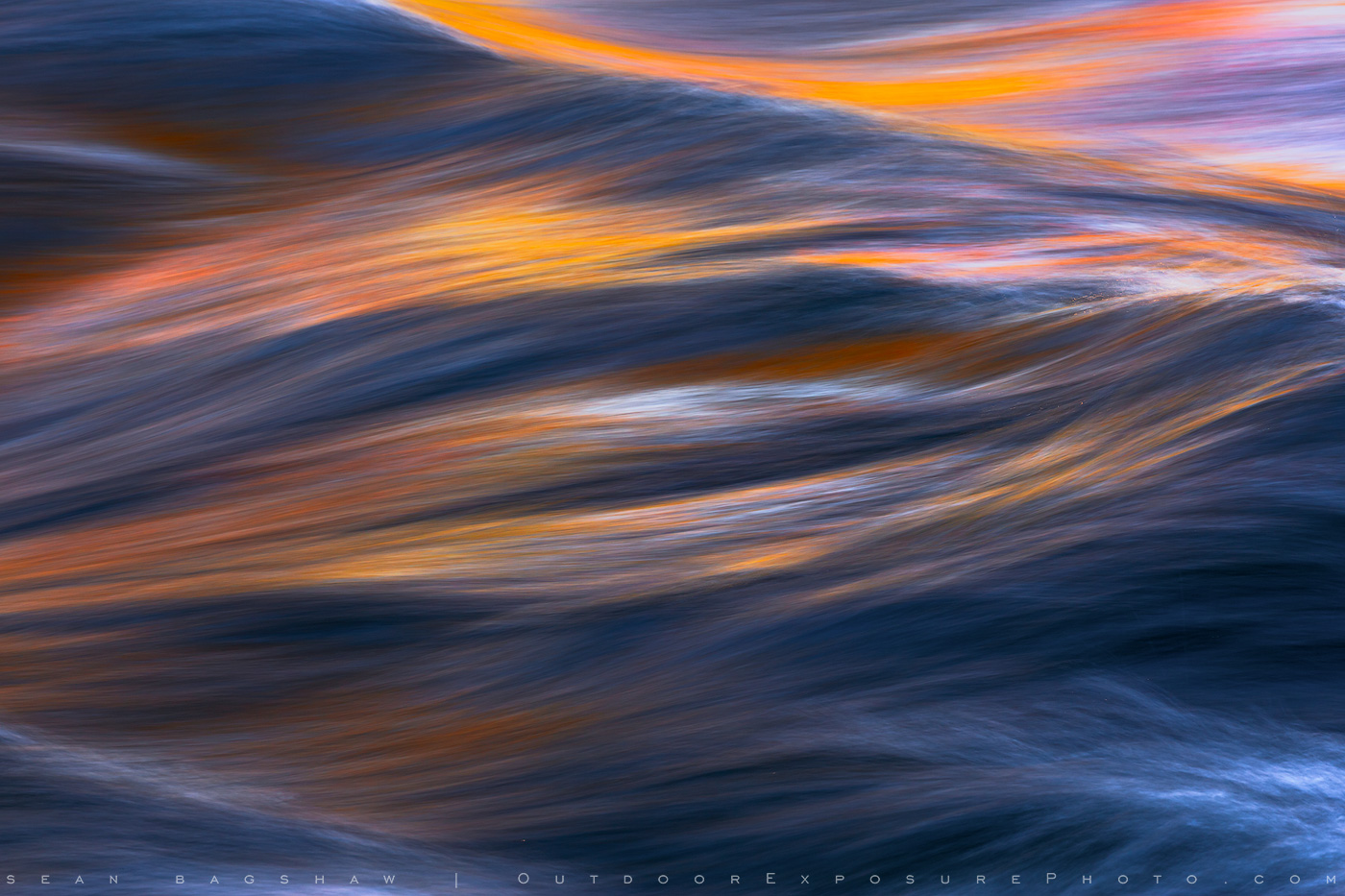 Shadowed rapids on the Deschutes River near Bend, Oregon reflects colors from illuminated objects on the shore.