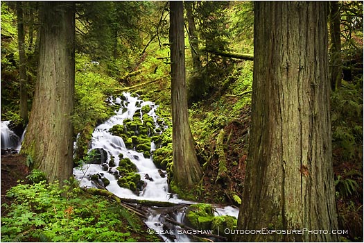 This stock photo contains the subjects stream, creek, cascade, waterfall, trees, forest, Columbia, river, wilderness area, green, moss, rocks, rocky, lush, rain forest.