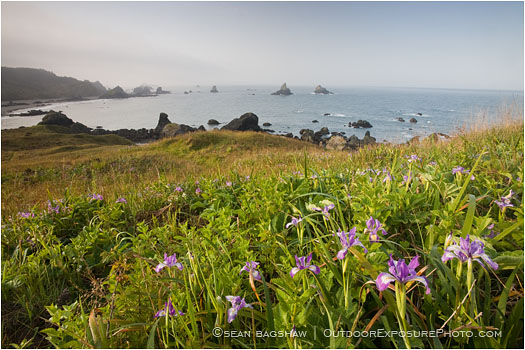 beach, boardman state park, brookings, low tide, ocean, Oregon, Oregon Coast, pacific, rocks, rocky, rocky coast, sand, shore, tide, waves, wild, iris, wildflowers, coast, horizontal, color image, purple