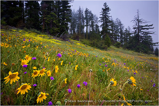 flora, flower, flowers, wildflowers, wild flowers, purple, yellow, pretty, scenic, spring, summer, forest, fog, trees