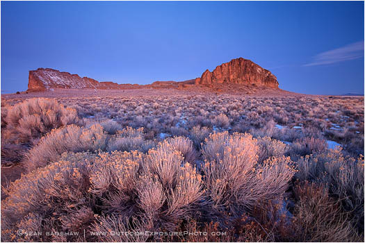 Fort Rock; Oregon; central Oregon; desert; frost; high desert; morning; rock; sage; twilight;