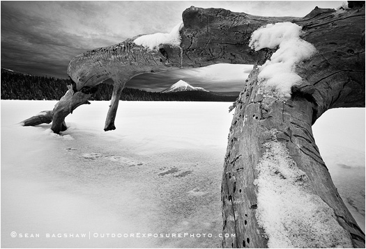 Lake of the Woods sits frozen in front of Mt. McLoughlin.