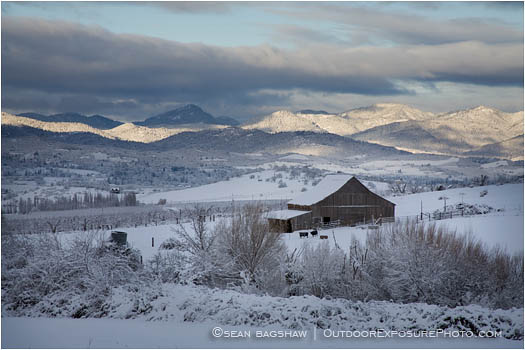 Snow blankets the rural countryside in the Rogue Valley of Southern Oregon.