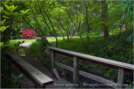 A lone red flower bush is seen through the opening after a wooden bridge in Lithia Park in Ashland, Oregon.
