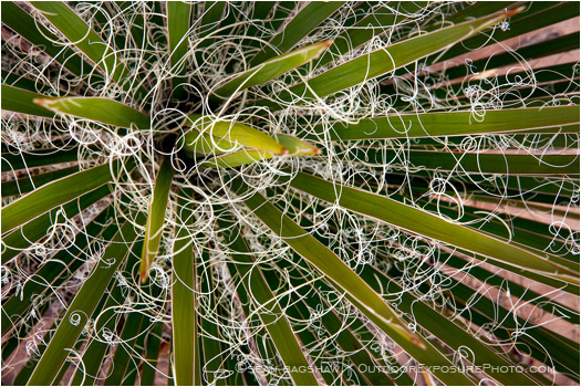 I find the radiating lines and fine, curling wisps of the yucca plant visually intriguing.