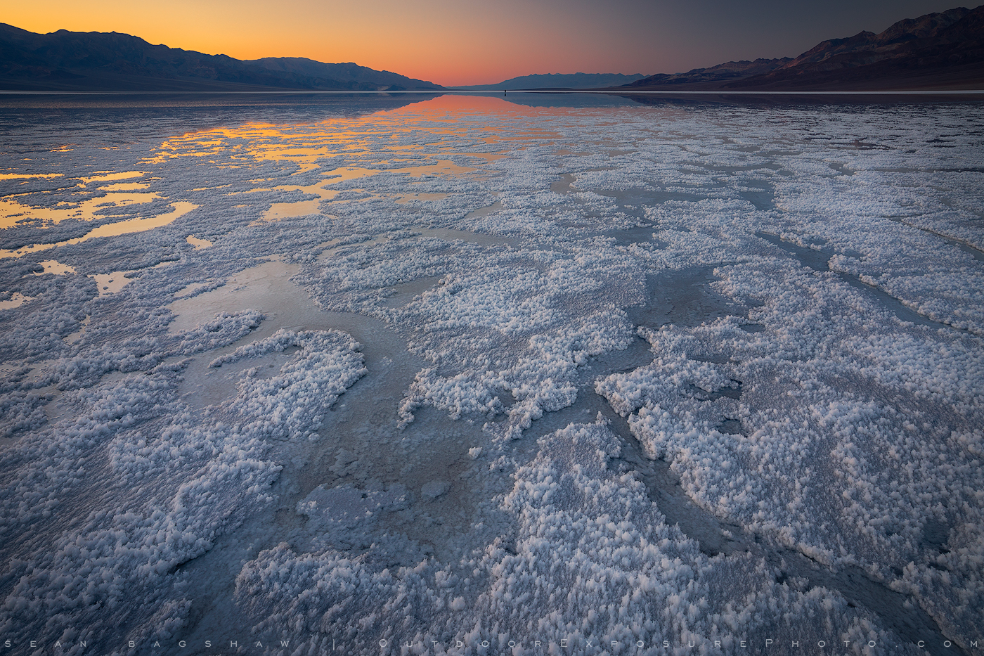 The rain this winter allowed a thin layer of water to pool on the Badwater salt flat in Death Valley National Park. Zack, David and I spent the twilight hour exploring the patterns, reflections and glowing light one evening on our recent road trip. The next day my shoes were completely encased in a crusty rime of salt. For scale, if you look closely you may see another photographer out in the water toward the horizon.
